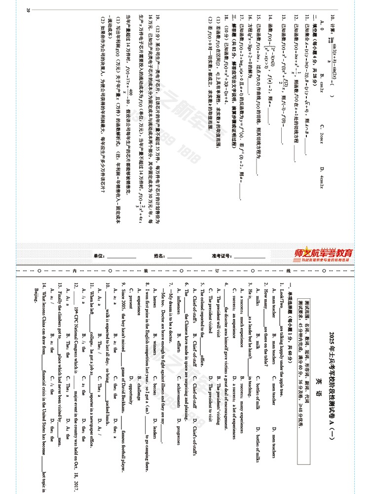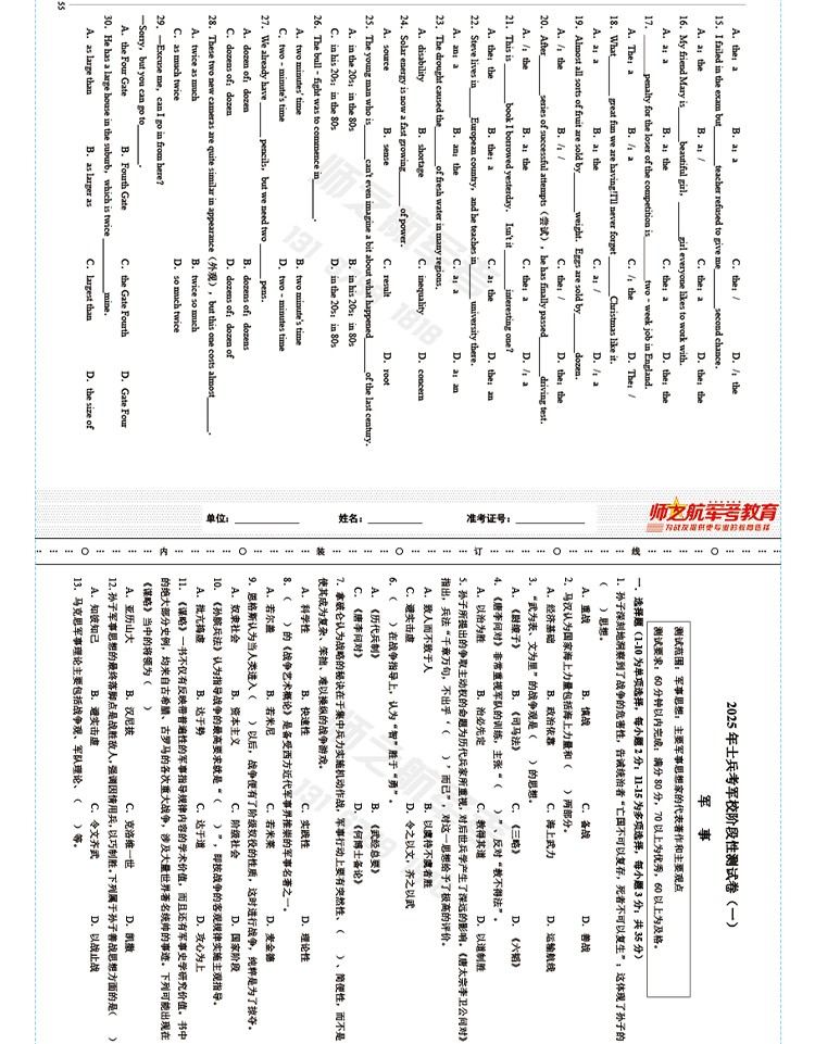 实物2026士兵提干复习军考试卷仿真练习模拟题仿真试题